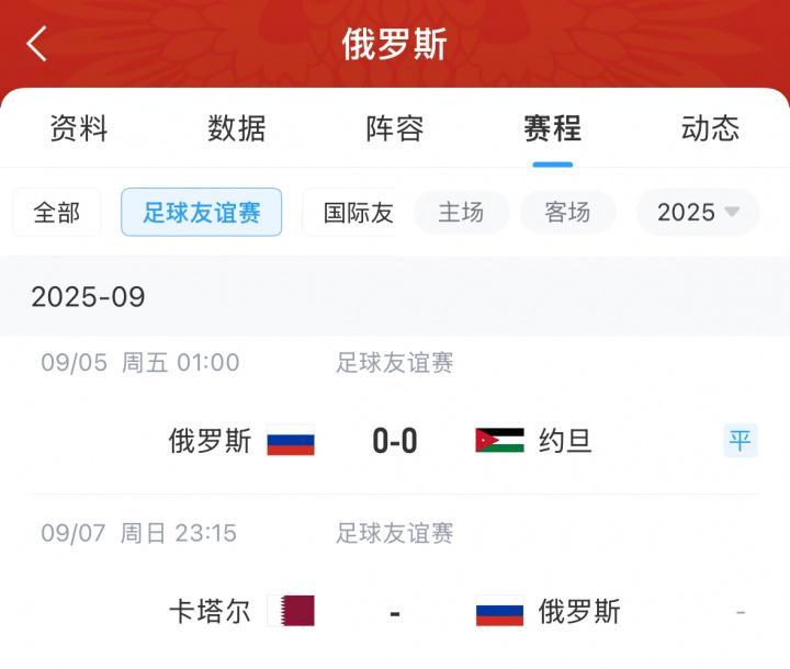 直播吧09月06日讯 昨日一场友谊赛,俄罗斯0-0战平约旦。本月友谊赛,俄罗斯将先后与亚洲杯冠军卡塔尔、亚洲杯亚军约旦交手。此前乌克兰足协在8月初发布声明,要求FIFA等各方禁止与俄罗斯球队进行友谊赛。不过昨日友谊赛依然正常进行。俄罗斯国家队在最新一期FIFA排名中,排在第35位。俄罗斯各级国家队与俱乐部队自2022年3月以来一直处于全球禁赛状态,这期间俄罗...